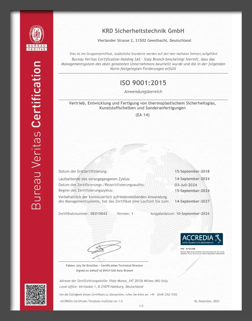 QM Zertifikat nach DIN EN ISO 9001:2015 für die Sicherheitstechnik